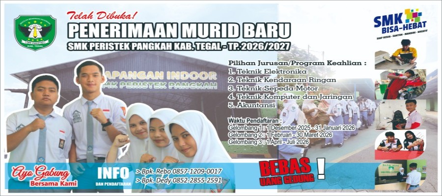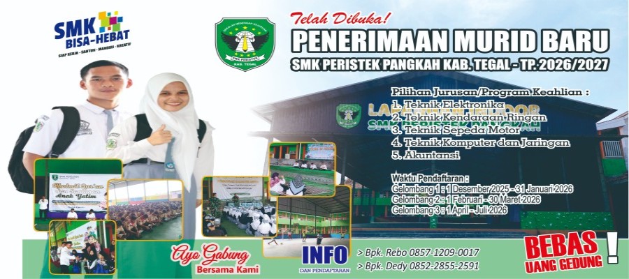 SMK Peristek Pangkah Kab. Tegal, sekolah berwawasan Islam dan Teknologi kembali membuka kesempatan bagi siswa-siswi kelas IX atau lulusan SMP/MTs/Se