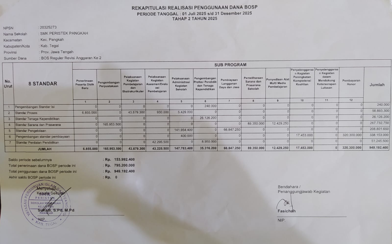 Berikut ini kami sampaikan Laporan Realisasi Penggunaan Dana BOSP Tahap II Tahun 2025 telah disusun :